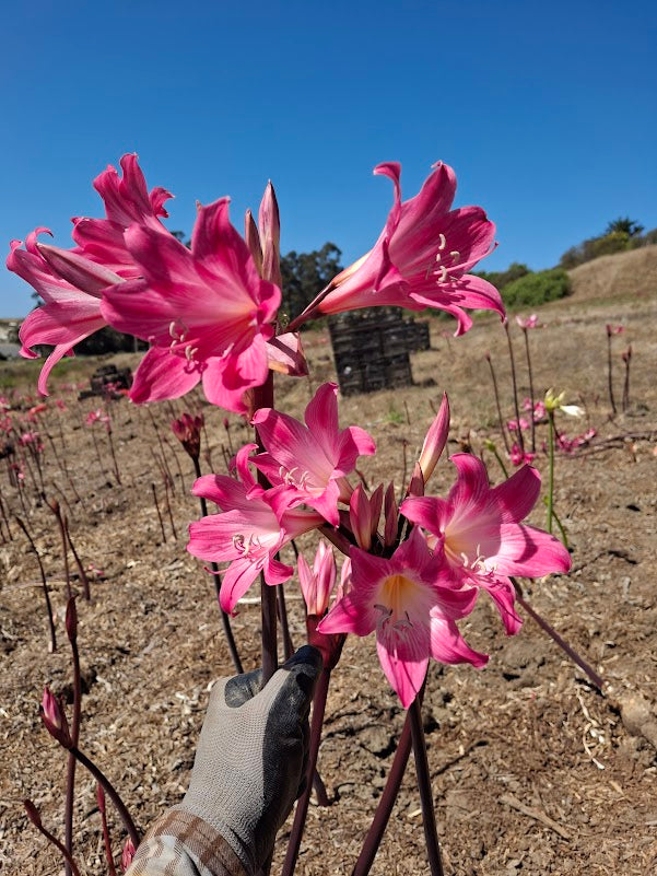 Amaryllis Belladonna are highly recommended for those with mild winters and relatively dry summers. Folks in other climates can grow them in large pots if they are willing to do the extra work of moving them seasonally. They are easily grown outside in zones 8-10 with mulch. Water occasionally whenever they are not receiving adequate rainfall. For customers in the Southeast and Midwest I recommend Lycoris rather than Amaryllis Belladonna.